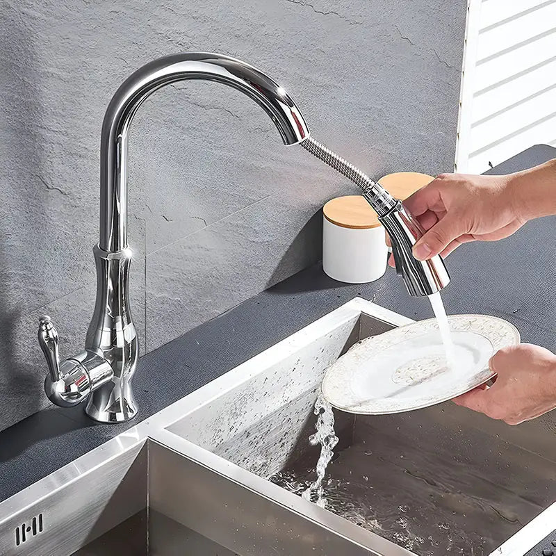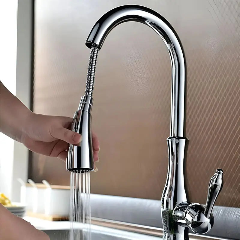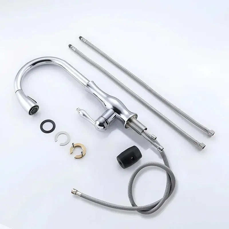Robinet de cuisine, équipé d’un mitigeur à levier unique. Douchette extractible pour faciliter le nettoyage et le remplissage, avec bec rotatif à 360° adapté aux éviers simples ou doubles. Conception en matériaux résistants, avec surface traitée contre les traces et la corrosion.