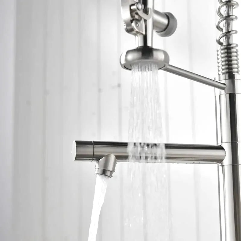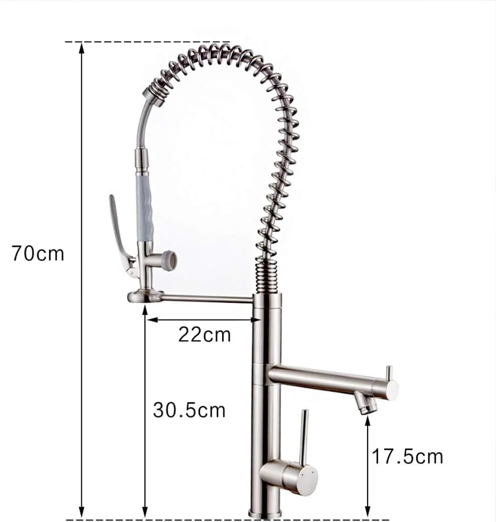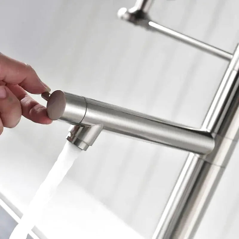 Robinet de cuisine en acier inoxydable avec structure à ressort flexible. Équipé d’un mitigeur et d’un pulvérisateur extractible offrant deux modes de jet, classique et haute pression. Bec pivotant à 360°, adapté aux éviers simples ou doubles. Finition résistante aux traces et à la corrosion. Installation sur pont compatible avec la plupart des éviers.